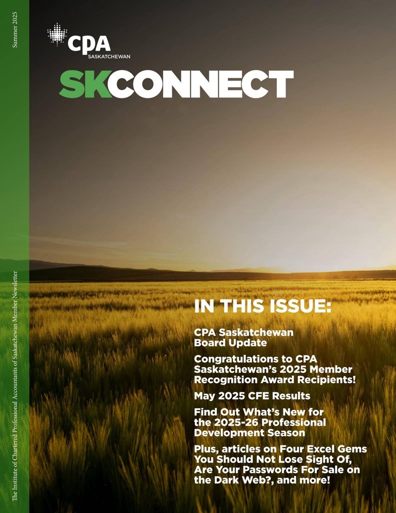 Congratulations to CPA Saskatchewan's seven 2025 Member Recognition Award recipients and successful May 2025 CFE writers! Learn more about recent updates to the CPA Saskatchewan Board, find out what's new for the 2025-26 Professional Development Season, plus, find articles on Four Excel Gems You Should Not Lose Sight Of, Are Your Passwords for Sale on the Dark Web?, and more!