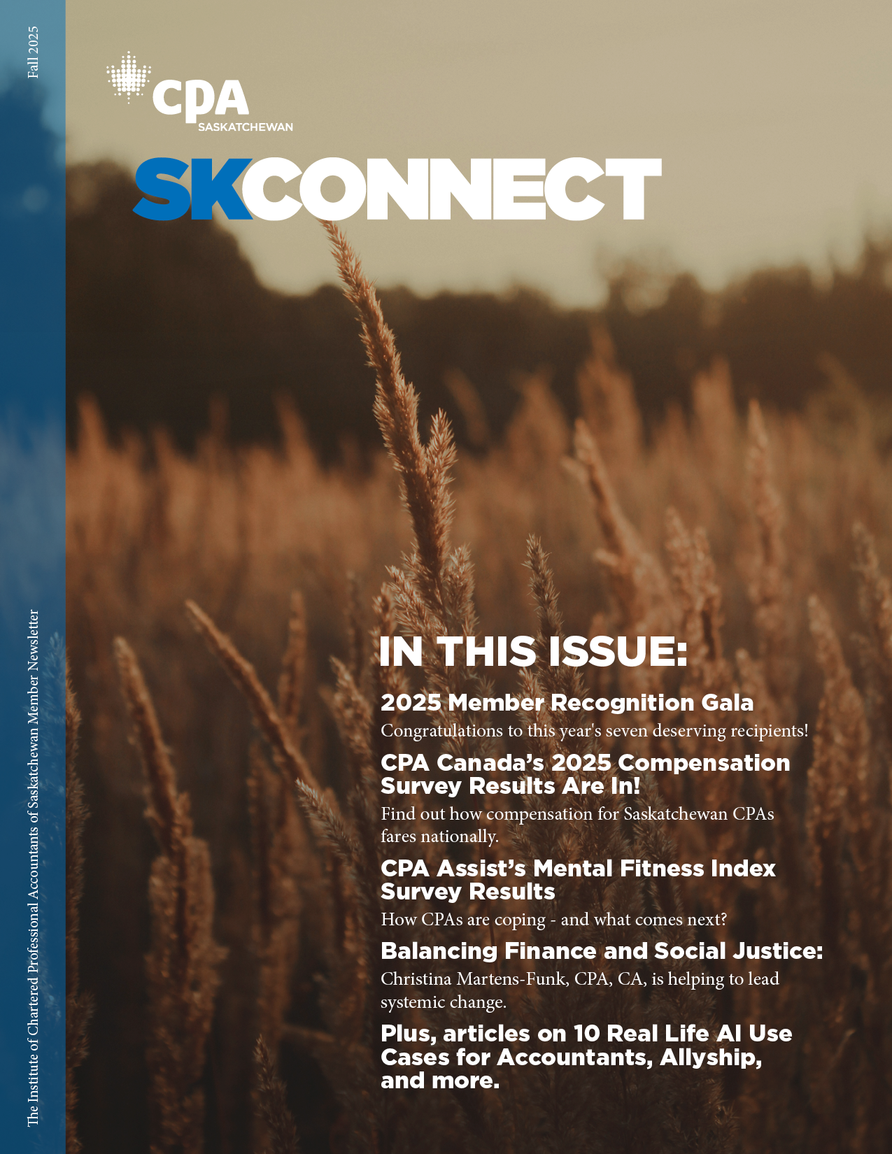 Read the Fall 2025 issue for a recap of the 2025 Member Recognition Gala, information about CPA Canada's 2025 compensation survey results with regional data for Saskatchewan, plus read about the results of CPA Assist's Mental Fitness Index survey, how CPA SK Member Christina Martens-Funk, CPA, CA is helping to lead systemic change, and articles on AI, allyship, and more.